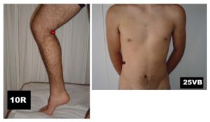En este caso, igualmente bajo control de test, es decir buscaremos la respuesta (brazos desiguales). Aplicaremos el autoadhesivo con frecuencia de «Tonificación Riñón Yin«, por ejemplo, en el punto agua, el 10R o en el punto Mu de R, el 25VB